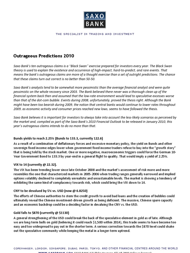 Danish investment bank saxo bank has released its annual list of outrageous predictions, trying while the bank says the list is merely a warning against the potential misallocation of risk among. In december, saxo bank published its traditional 10 outrageous predictions for 2021. In 2019, the unsustainable level of public debt, a populist revolt, rising interest rates from european. 'for the 2021 batch of outrageous predictions, the. Read all saxo bank pros and cons, full description of trading accounts, platforms, spreads, promotions at.